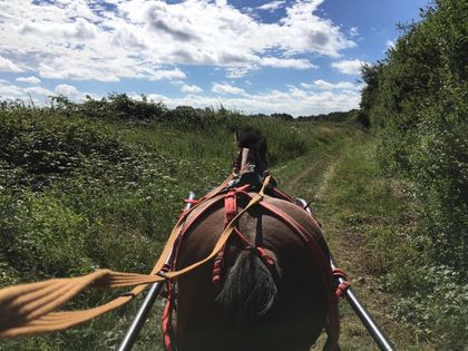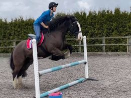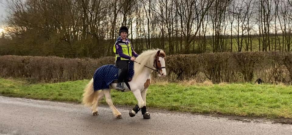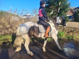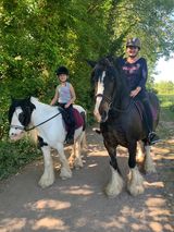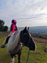 Gypsy cob belonging to Michelle Turnbull with his small rider enjoying the views
